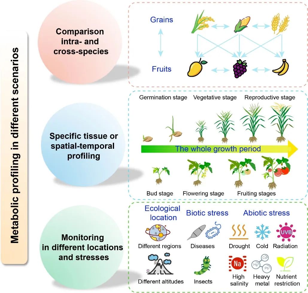 代谢谱分析能够提供一种化学指纹,代表生物或样本在特定时间点的生化状态,被分析的代谢物可以是植物代谢途径的中间产物或最终产物,也可以是由于外界环境条件的影响所产生。这种代谢物快照分析方法目前已被广泛应用于植物基础科学研究和健康、农业和食品科学的不同场景,如区分不同的植物品种、探索不同植物代谢物积累的特点及进化规律、识别具有潜在健康益处的生物活性化合物、构建植物发育过程中的时空代谢图谱、监测植物对不同生态环境和胁迫的代谢响应等多个方面,本文就其中主要的3个应用方向进行了详细的总结和讨论,以期为相关的代谢组学研究方向提供思路。