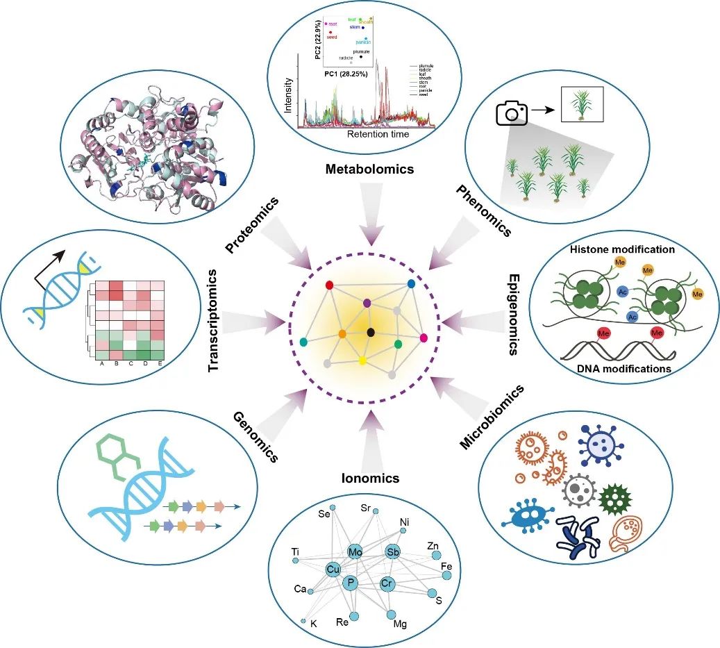 科学技术的巨大进步推动我们进入了多组学时代,代谢组学以代谢物为标志,被认为是最接近生物表型的组学。植物多种代谢物相互关联,形成一个错综复杂、调控严格的代谢网络,单一组学的使用往往具有偏见性。通过对基因组、转录组、蛋白组、表观组、表型组、微生物组、离子组和代谢组等不同水平的组学进行整合和分析,不仅可以相互验证,也可以相互补充,将有助于全面、深入的研究植物代谢在合成、调控和进化过程中的多样性和自然变异等方面。