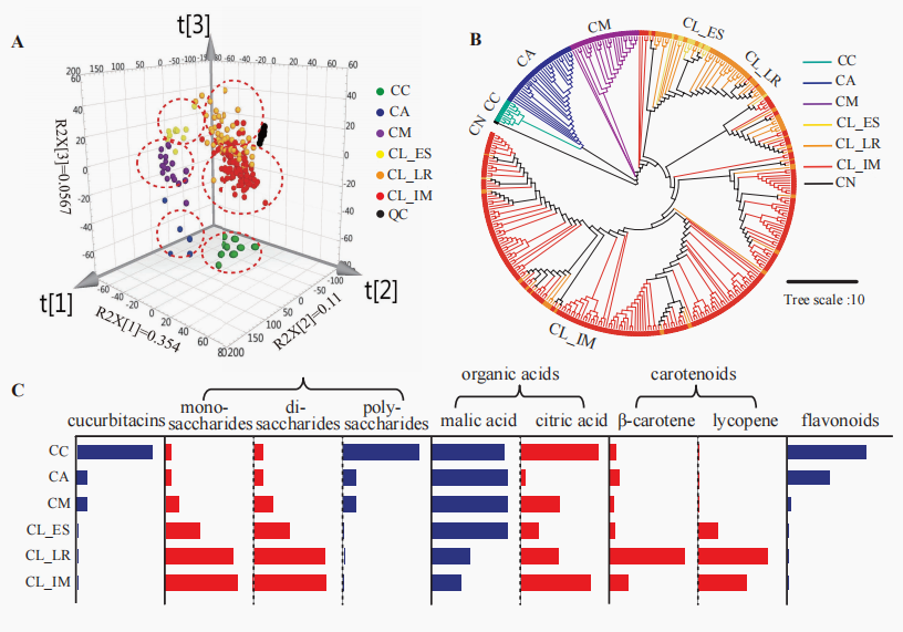 此外,研究还发现了一个调控葫芦素生物合成的新基因簇CGC1,该基因簇包含转录因子和结构基因。在该基因簇中,存在从转录因子ERFs到bHLHs再到结构基因GT、P450s、Bi这样的级联调控作用。本研究为西瓜驯化过程中果实代谢组学动态的研究提供了依据,也为了解作物代谢组学的驯化改良提供了有力途径。