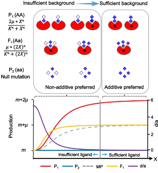 为明确遗传背景与杂种优势及非加性效应的内在关系,作者利用希尔方程系统模拟了不同场景中不同配体浓度下受体在双亲及其杂种中的反应,模拟结果进一步从理论上说明非加性及杂种优势的形成与遗传背景密不可分。基于以上结果,作者提出不充分背景下的纯合子功能不足是非加性及杂种优势形成的核心机制,并将其命名为 HoIIB (Homo-insufficiency under insufficient background)模型(图2)。
