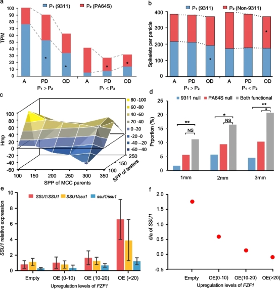 根据HoIIB模型,既然非加性的形成与遗传背景有关,理论上非加性与加性之间可以因遗传背景的不同而发生转换。作者在二倍体酵母体系实验中验证了该推断。实验结果显示,在野生型中目标基因SSU1在转录水平及其对酵母生长的效应方面均表现出超显性,当上调其背景(即其转录因子)FZF1的表达时,随着FZF1转录水平增强,目标基因SSU1的显性度逐渐降低而接近加性(图3 e-f)。对水稻产量相关基因Hd3a的分析同样印证了该模型。