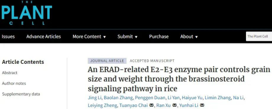 2022年12月15日,Plant Cell在线发表了中国科学院遗传与发育生物学研究所李云海团队完成的题为“An ERAD-related E2-E3 enzyme pair controls grain size and weight through the brassinosteroid signaling pathway in rice“的研究论文,入驻启航娱乐城
