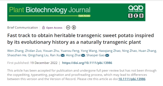 2022年12月19日,入驻海南大学三亚南繁研究院的徐冉教授与中国农业大学甘薯研究室合作在Plant Biotechnology Journal上发表了题为Fast track to obtain heritable transgenic sweet potato inspired by its evolutionary history as a naturally transgenic plant的论文。受天然转基因作物甘薯启发,该研究揭示了天然转基因植物的广泛存在暗示植物遗传转化的“快车道”。