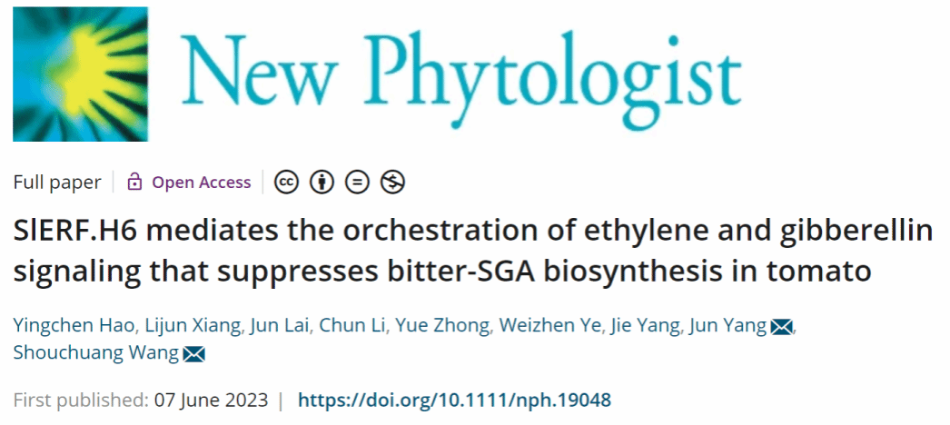 王守创团队在New Phytologist(中科院一区,影响因子10.3)发表题为“SlERF.H6 mediates the orchestration of ethylene and gibberellin signaling that suppresses bitter-SGA biosynthesis in tomato”的研究论文,海南大学博士研究生郝英辰、硕士研究生向丽君为论文的共同第一作者。该研究对349份番茄材料的甾体生物碱类(Steroidal glycoalkaloids,SGA)物质进行检测,通过基于代谢物的全基因组关联分析(metabolite genome wide association study, mGWAS)定位到一个AP2/ERF转录因子SlERF.H6。构建该基因的转基因材料检测SGA的含量变化,发现SlERF.H6通过调控GAMEs基因表达参与番茄SGA生物合成并负调控苦味SGA的合成。进一步研究表明,SlERF.H6作为转录因子可抑制赤霉素氧化酶SlGA2ox12基因的表达,使番茄体内的赤霉素前体水平升高,从而导致SGA的含量降低。此外,研究发现 SlERF.H6 作用于乙烯下游并抑制SlGA2ox12的表达,导致非活性 GA 的增加。该研究解析了SlERF.H6在调节乙烯和赤霉素之间的串扰信号进而调控SGA生物合成中的关键作用,为解析SGA调控机制提供了新思路,也为人们采用多种技术来培育优良番茄品种奠定基础。