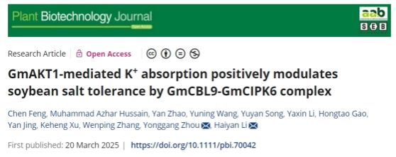 近日,海南大学李海燕团队在Plant Biotechnology Journal杂志在线发表了”GmAKT1-mediated K+ absorption positively modulates soybean salt tolerance by GmCBL9-GmCIPK6 complex”的研究论文。该研究工作通过创制过表达和敲除大豆材料,鉴定到钾离子通道蛋白基因GmAKT1具有正向调控大豆耐盐性的作用。然后,对GmAKT1的上游调控网络进行解析,通过互作蛋白筛选,明确了大豆中存在GmAKT1与GmCIPK6以及GmCIPK6与GmCBL9的相互作用关系,以此构成一个“GmCBL9-GmCIPK6-GmAKT1”调控大豆耐盐性的分子模块。进一步,结合电生理体系以及多基因聚合大豆材料表型分析等,揭示GmCBL9-GmCIPK6复合体通过磷酸化并激活GmAKT1对K+的吸收,进而维持体内Na+/K+平衡,最终提高大豆耐盐性的分子机制。