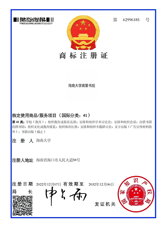 2022年12月29日,"海南大学三亚南繁书院"商标获国家知识产权局批准注册。该商标注册有效期自2022年12月7日起至2032年12月6日,服务于启航娱乐城 的书院制建设、教育培训、文创产品创制、学术研讨会的开展、举办文体比赛、文化展览、书籍出版等项目,为更好的建设启航娱乐城 提供平台。