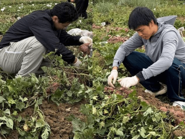 两位同学在田间进行劳动实践(左图:何培鑫 右图:胡铮宇)