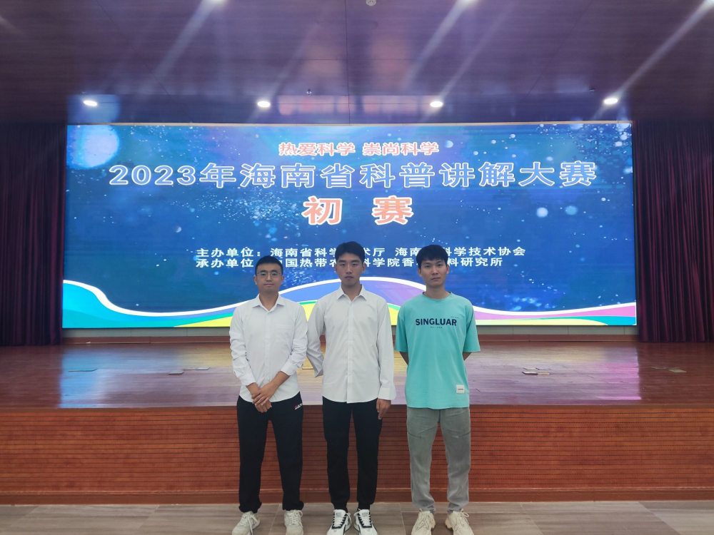 代表鲍次次、李鹏、王建波经过院内初赛选拔,代表崖州书院参加2023年海南省科普讲解大赛初赛。这次比赛不仅考验了选手们的知识和技能,也提升了选手们的毅力和决心。希望选手们能从这次经历中学到宝贵的经验,并在未来的科学研究和科普工作中取得更大的提升,也希望广大青年学子积极服务社会,参与科普活动,为海南自贸港建设贡献自身力量。